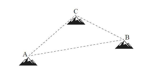 Based on a coordinate grid, the location of A is \( A = (0, 0, 2.8) \) and the location of B is \( B = (7.2, 5.1, 2.4). \) All measurements are in kilometres.