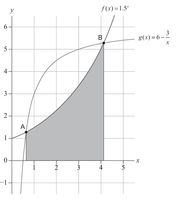 \( \int_{0.638}^{4.10} \big[ g(x) – f(x) \big] \, dx = \int_{0.638}^{4.10} \left(6 – \frac{3}{x} – 1.5^x\right) dx \approx 5.38 \).