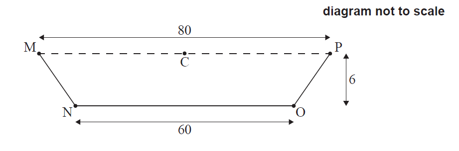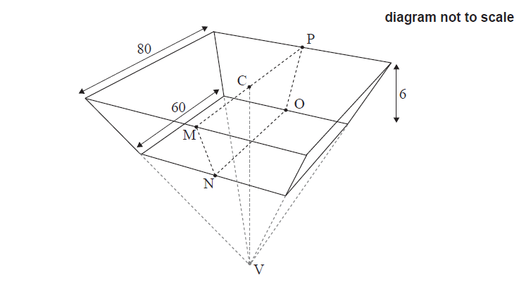 The bottom of the reservoir is a square of length \( 60 \) metres that is parallel to the base of the pyramid, such that the depth of the reservoir is \( 6 \) metres. A vertical cross section, \( MNOPC \), of the reservoir is shown.