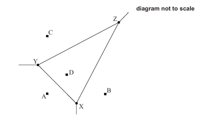 The Voronoi diagram below shows four Hypermarkets represented by points with coordinates \(A(0,0)\), \(B(6,0)\), \(C(0,6)\) and \(D(2,2)\). The vertices \(X, Y, Z\) are also shown. All distances are measured in kilometres.