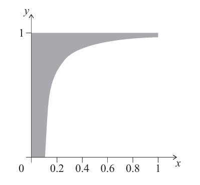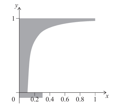 Area = \( \int_{0.1}^{1} y \, dx = \int_{0.1}^{1} \frac{2}{3} \cos^{-1}\left( \frac{1}{10x} \right) dx \).