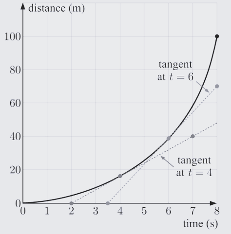 The tangent at $t=4$ passes through $(2,0)$ and $(7,40)$.