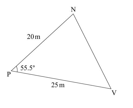 \(NV^2 = 20^2 + 25^2 – 2(20)(25)\cos 55.5^\circ\)