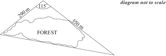 A path goes around a forest so that it forms the three sides of a triangle. The lengths of two sides are 550 m and 290 m. These two sides meet at an angle of 115°. A diagram is shown below.
