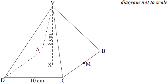 The diagram below shows a square based right pyramid. ABCD is a square of side 10 cm. VX is the perpendicular height of 8 cm. M is the midpoint of BC.