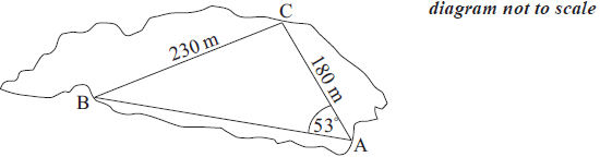 Inside the forest a second path forms the three sides of another triangle named ABC. Angle BAC is 53°, AC is 180 m and BC is 230 m.
