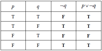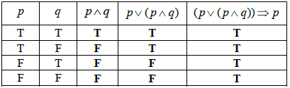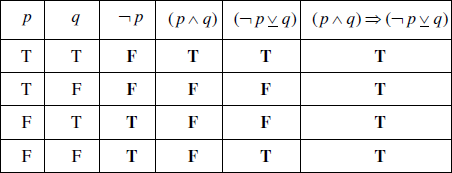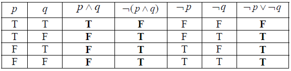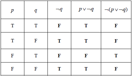 columns \(\neg \left( {(r \wedge p) \vee \neg q)} \right)\) and \(\neg (r \wedge p) \wedge q\) are identical (R1)(C2)