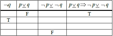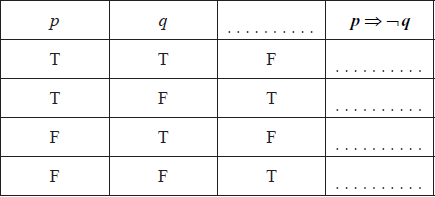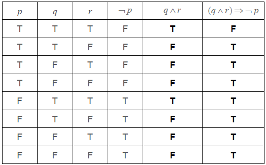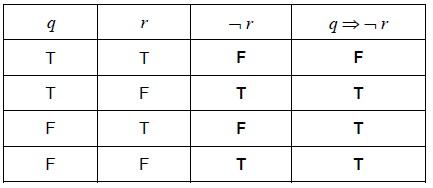 Award (A0)(A1)(ft) for a \(q \Rightarrow \neg r\) column that correctly follows from an incorrect \(\neg r\) column.