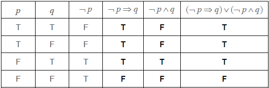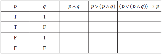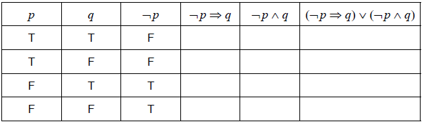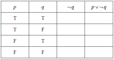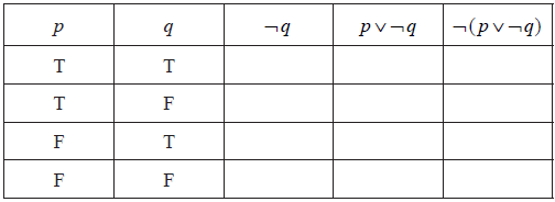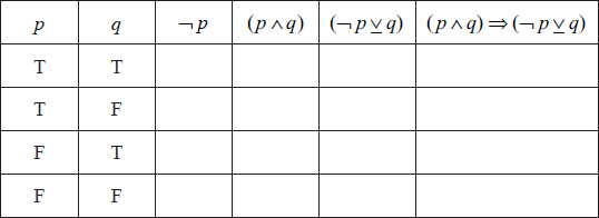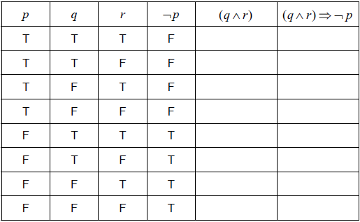 Note: Award (A1) for \(q \vee \neg r\) column correct and (A1)(ft) for \((q \vee \neg r) \Rightarrow p\) column correct. Follow through from their \(q \vee \neg r\) column.[2 marks]