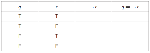 Note: Award (A1) for \(\neg r\) column correct and (A1) for \(q \Rightarrow \neg r\) column correct.