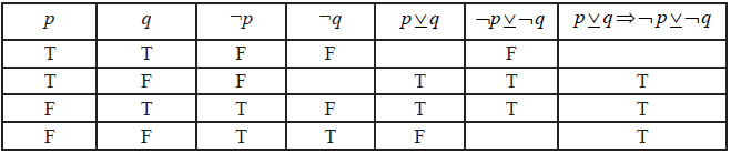 \(p\underset{\raise0.3em\hbox{$\smash{\scriptscriptstyle-}$}}{ \vee } q \Rightarrow \neg {\text{ }}p\underset{\raise0.3em\hbox{$\smash{\scriptscriptstyle-}$}}{ \vee } \neg q\)