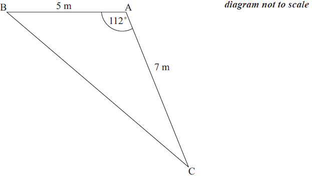 \(\sin\) \({\text{B}}{\operatorname {\hat V}}{\text{M}}\) \( = \frac{{1.6}}{{3.6}}\) where M is the midpoint of BC (M1)(A1)