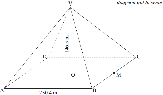 ABCDV is a solid glass pyramid. The base of the pyramid is a square of side 3.2 cm. The vertical height is 2.8 cm. The vertex V is directly above the centre O of the base.