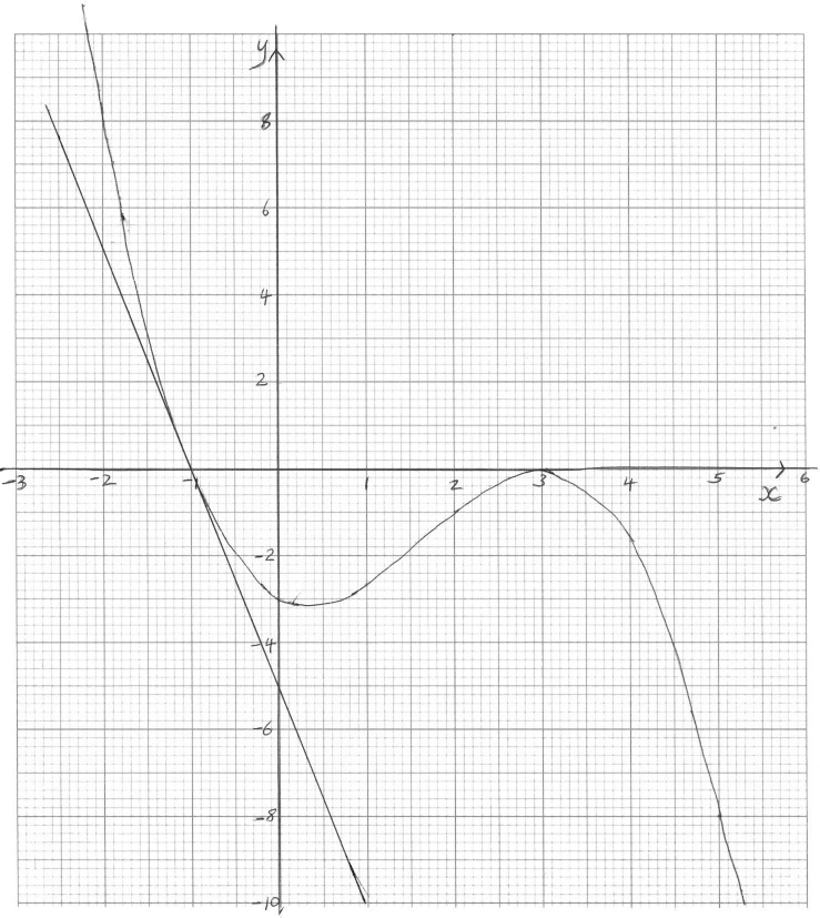Draw the graph of \(f\) for \( – 3 \leqslant x \leqslant 3\) and \( – 40 \leqslant y \leqslant 20\). Use a scale of 2 cm to represent 1 unit on the \(x\)-axis and 1 cm to represent 5 units on the \(y\)-axis.[4]