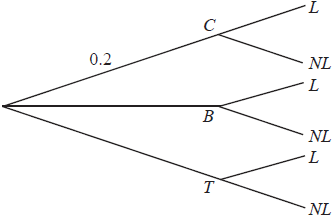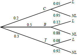 When Geraldine travels to work she can travel either by car (C), bus (B) or train (T). She travels by car on one day in five. She uses the bus 50 % of the time. The probabilities of her being late (L) when travelling by car, bus or train are 0.05, 0.12 and 0.08 respectively.