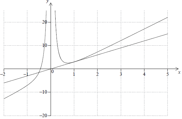 On the same diagram, sketch the line \(y = 7 − 2x\) and find the coordinates of the point of intersection of the line with the curve.[3]