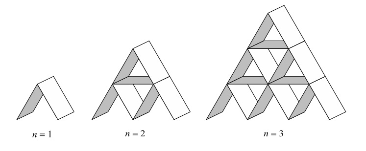 (c) The number of cards in row \( k \) (counting from the top) is given by \( 2k \) (angled cards) + \( (k-1) \) (horizontal cards) = \( 3k – 1 \).