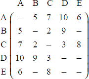 The table below shows the distances between towns A, B, C, D and E.