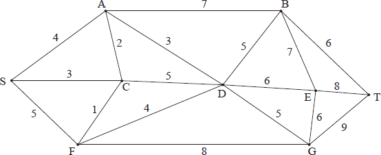 Using Dijkstra’s algorithm, find the length of the shortest path from vertex S to vertex T . Write down this shortest path.