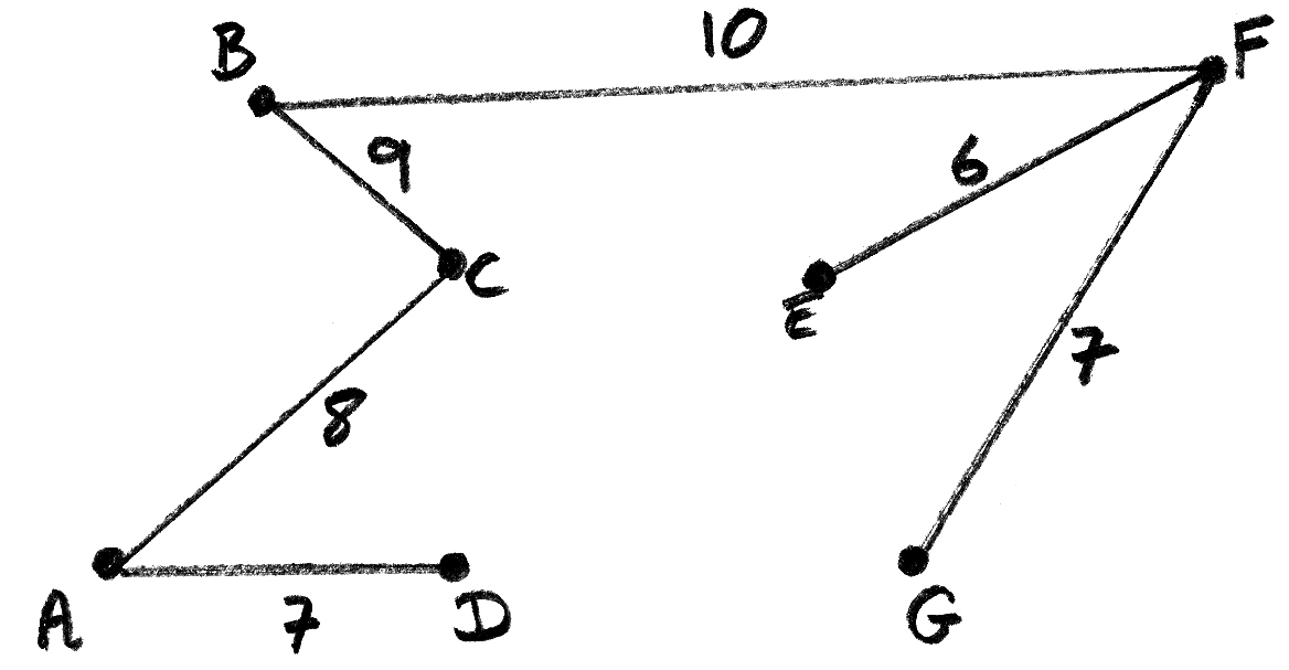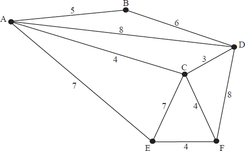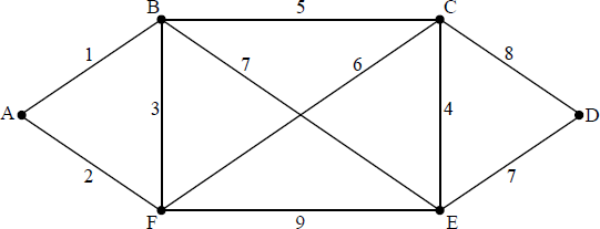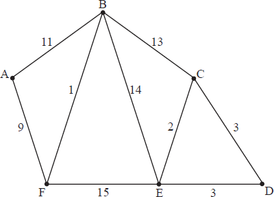 Sameer is trying to design a road system to connect six towns, A, B, C, D, E and F. The possible roads and the costs of building them are shown in the graph below. Each vertex represents a town, each edge represents a road and the weight of each edge is the cost of building that road. He needs to design the lowest cost road system that will connect the six towns.
