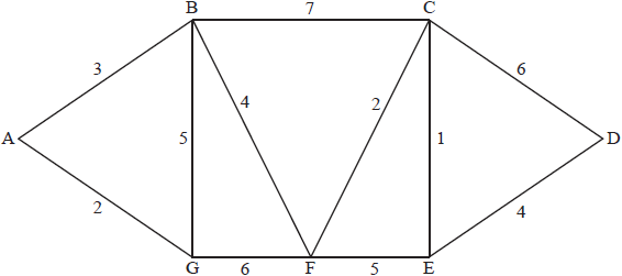 The method was generally known. Some candidates used nearest neighbour instead of Kruskal’s algorithm to find a minimal spanning tree. Some forgot to add in the two edges connected to . Some with the right method made mistakes in not noticing the correct edge to choose. A