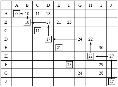 \(\begin{array}{*{20}{l}} {{\text{the nearest neighbour path is}}}&{{\text{A}} \to {\text{D}} \to {\text{C }}A1} \\ {}&{ \to {\text{E}} \to {\text{B}} \to {\text{F}} \to {\text{A }}A1} \end{array}\)