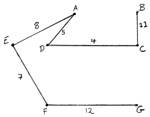 Use Dijkstra’s algorithm to find the shortest path from A to D in the following weighted graph and state its length.
