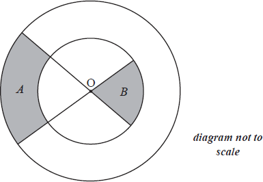 The diagram below shows two straight lines intersecting at O and two circles, each with centre O. The outer circle has radius R and the inner circle has radius r .