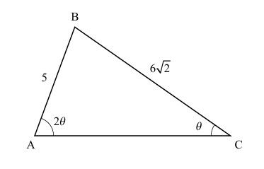 Let \( AB = 5,\; BC = 6\sqrt{2},\; \angle ACB = \theta,\; \angle BAC = 2\theta,\; \) and \( 0 < \theta < \frac{\pi}{2}. \)Relevant Syllabus Topic Codes (IB Mathematics AA HL):