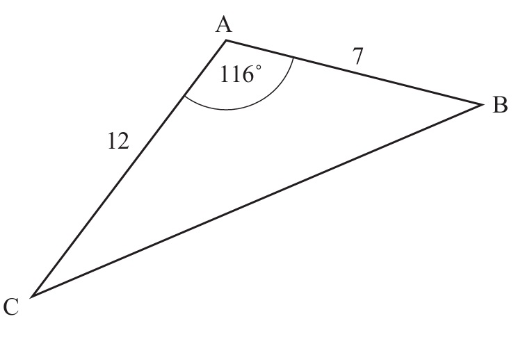 \( BC^2 = 7^2 + 12^2 – 2 \times 7 \times 12 \times \cos(116^\circ) \)