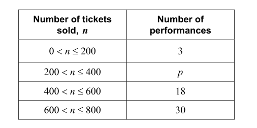 A ballet company performs The Nutcracker every year. Last year they gave a total of 60 performances at their theatre which has a maximum capacity of 800. The number of tickets sold, \( n \), at each performance is shown in the following frequency table.