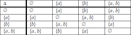 Let the set of all these subsets be denoted by \(P(A)\) . The binary operation symmetric difference, \(\Delta\) , is defined on \(P(A)\) by \(X\Delta Y = (X\backslash Y) \cup (Y\backslash X)\) where \(X\) , \(Y \in P(A)\).