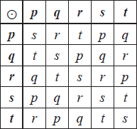 The Cayley table for the binary operation \( \odot \) defined on the set T = {p, q, r, s, t} is given below.