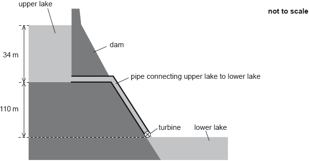 The hydroelectric system has four 250 MW generators. The specific energy available from the water is 2.7 kJ kg–1. Determine the maximum time for which the hydroelectric system can maintain full output when a mass of 1.5 x 1010 kg of water passes through the turbines.[2]