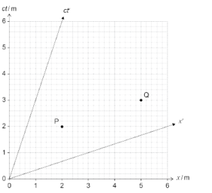 (i) From the diagram, event P has coordinates \((x=2, ct=2)\) and event Q has coordinates \((x=5, ct=3)\).