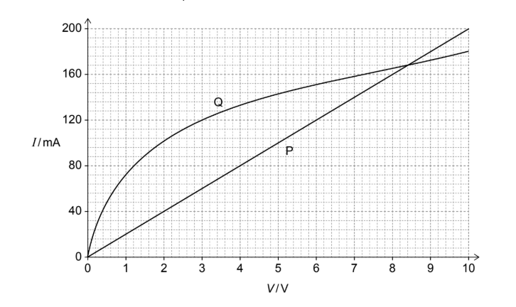 The graph illustrates how the current \(I\) varies with the potential difference \(V\) for an ohmic resistor P and a non-ohmic component Q.
