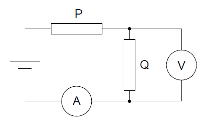P and Q are connected in a circuit with a cell of negligible internal resistance, as shown. The ammeter and voltmeter are ideal. The voltmeter reading is \(3.0\,V\).