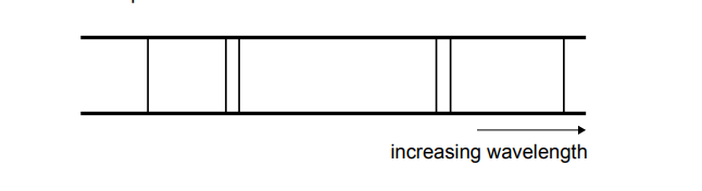The spectrum shows lines that get closer together (converge) as wavelength decreases (frequency/energy increases). This convergence is characteristic of electron transitions.