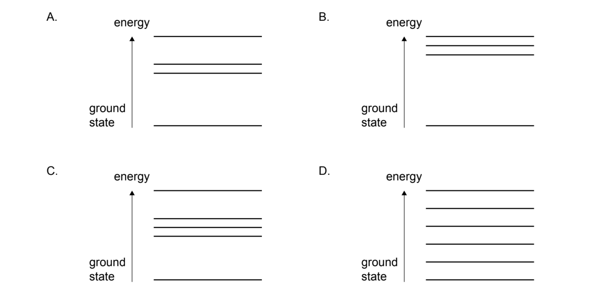 Diagram A shows levels converging at higher energy (away from the ground state). This is the standard model for atomic energy levels (e.g., Hydrogen).