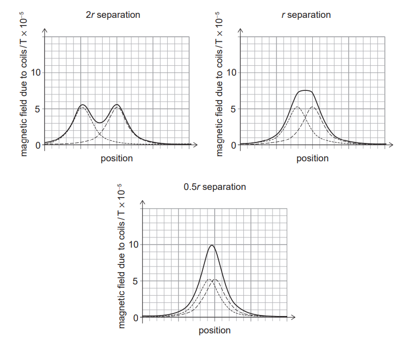 The students should choose the separation \(r\). This separation produces the most uniform magnetic field between the coils, as indicated by the flat region of the field curve, ensuring a nearly constant field across the magnet.