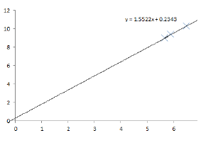 \[K = \frac{\Delta P}{\Delta (1/V)} \approx 1.56\]