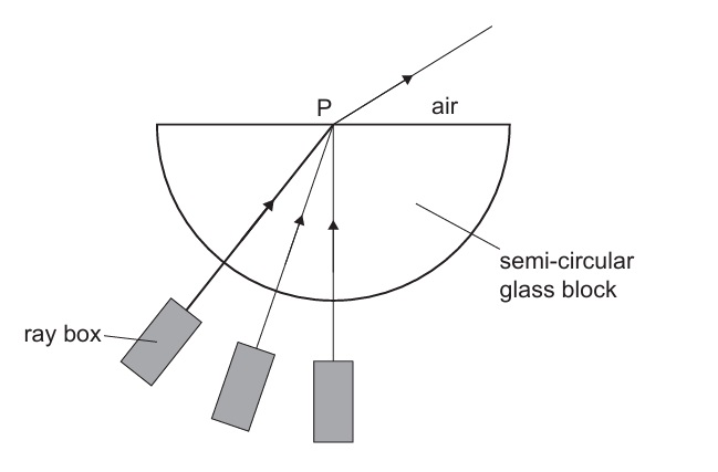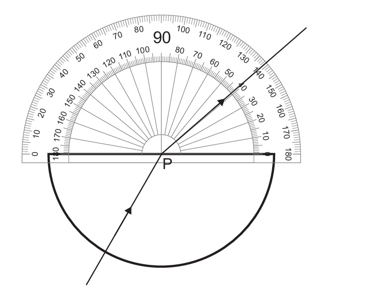 Ensure the incident ray is directed toward the centre P of the flat side so that it strikes along a radial line (angle of incidence = 0° at the curved surface).