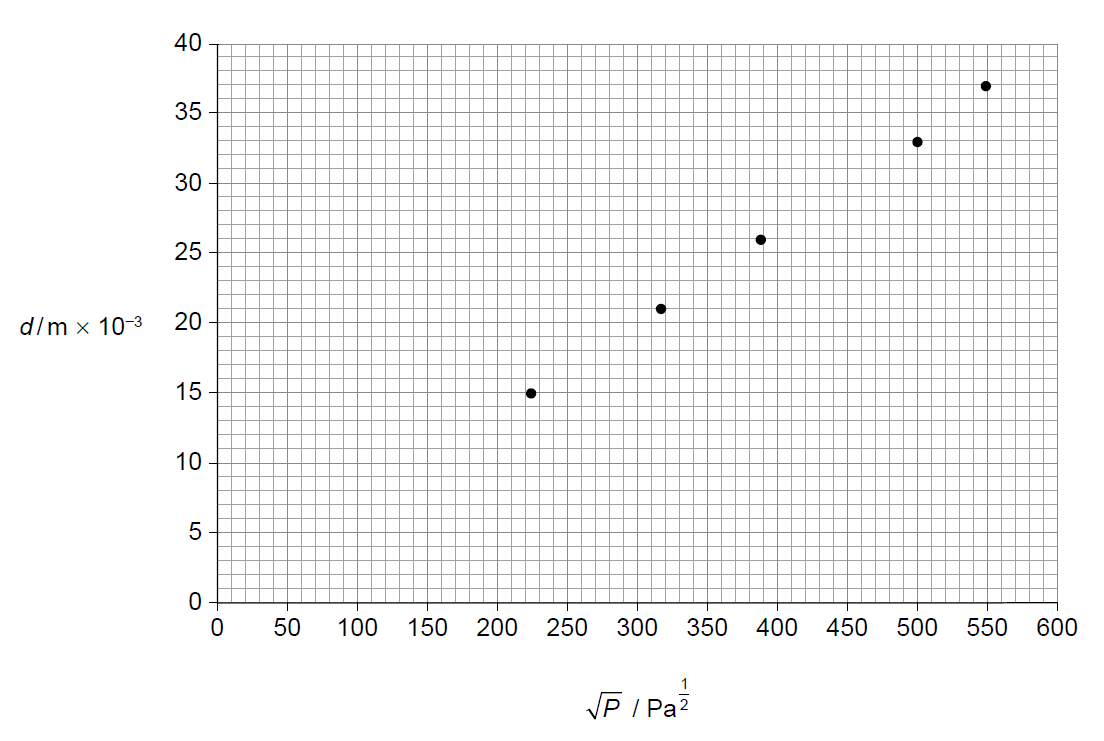 (ii) The percentage uncertainty in \(P\) is \(\pm 8\%\). Determine the uncertainty in \(\sqrt{P}\) when \(d = 33\,mm\) and draw the uncertainty bar for this data point on the graph.