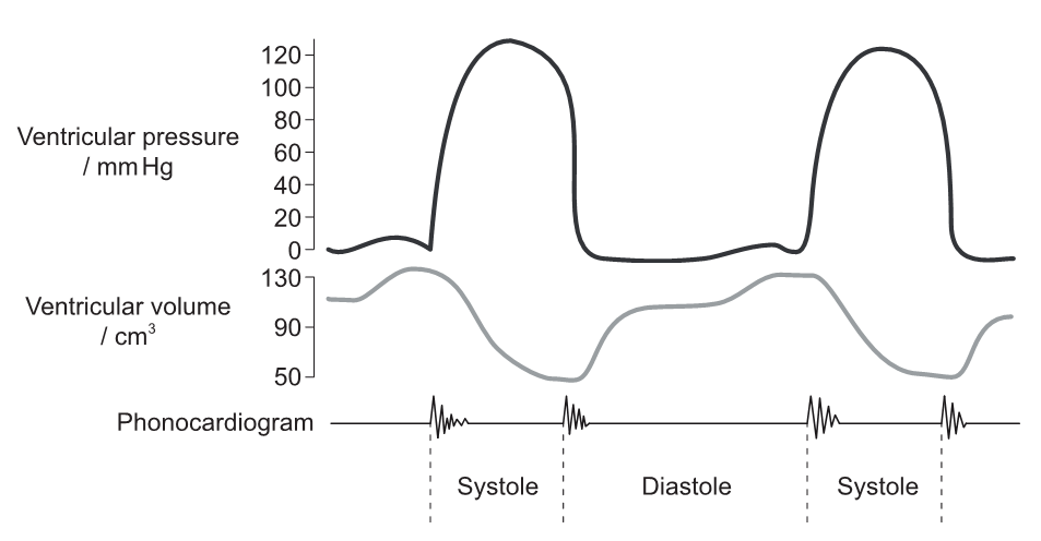The diagram shows changes in the pressure and volume of the left ventricle during normal heartbeat. The phonocardiogram records heart sounds during the cardiac cycle.