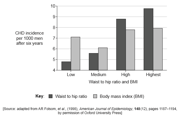 The incidence of coronary heart disease (CHD) was investigated among 14 000 people. Baseline measurements of the waist to hip ratio and body mass index (BMI) were collected from the participants. After six years, evidence of CHD was identified in follow-up interviews. The bar chart shows the results for the men only.