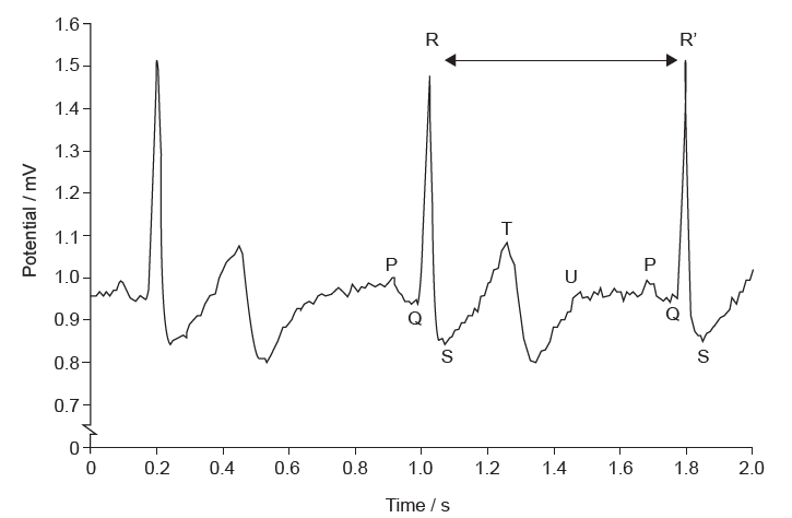 The graph below shows a normal electrocardiogram (ECG) trace.