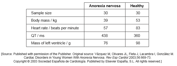 The QT interval corresponds to the time it takes for the ventricles of the heart to contract and then start to refill with blood before beginning the next contraction. Measures of QT interval were taken from 15-year-old female patients with anorexia nervosa and compared to healthy females of the same age. The body mass, heart rate and the mass of the left ventricle were also measured and the mean values are shown in the table.