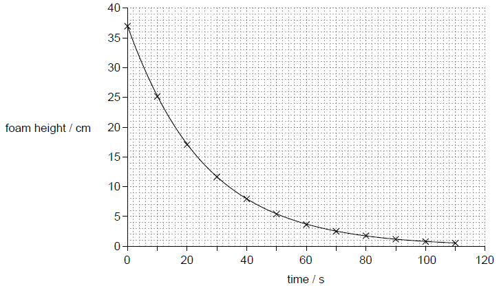 A student pours a canned carbonated drink into a cylindrical container after shaking the can violently before opening. A large volume of foam is produced that fills the container. The graph shows the variation of foam height with time.