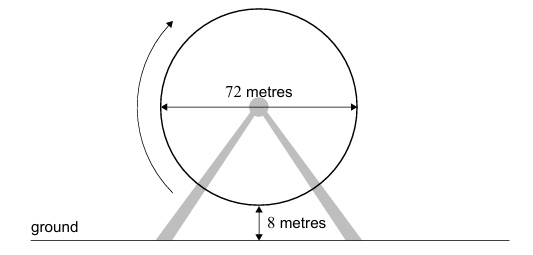 The radius of the wheel is \( 72 / 2 = 36 \) m, which represents the amplitude. Since the seat starts at the lowest point (a minimum), the cosine function is reflected.