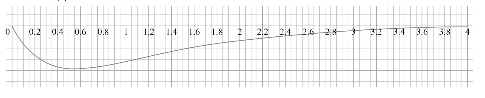 Sketch should show: starts at \(x=0\), decreases to a minimum near \(t \approx 0.55\), then increases asymptotically toward 0.
